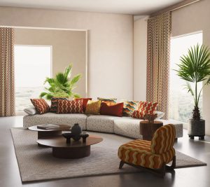 Layered waves of terracotta, saffron, sand, and sky-blue flow across cushions, upholstery, and drapery—each piece designed to echo the gentle rhythm of the season. Create a room that feels alive with energy yet anchored in comfort.